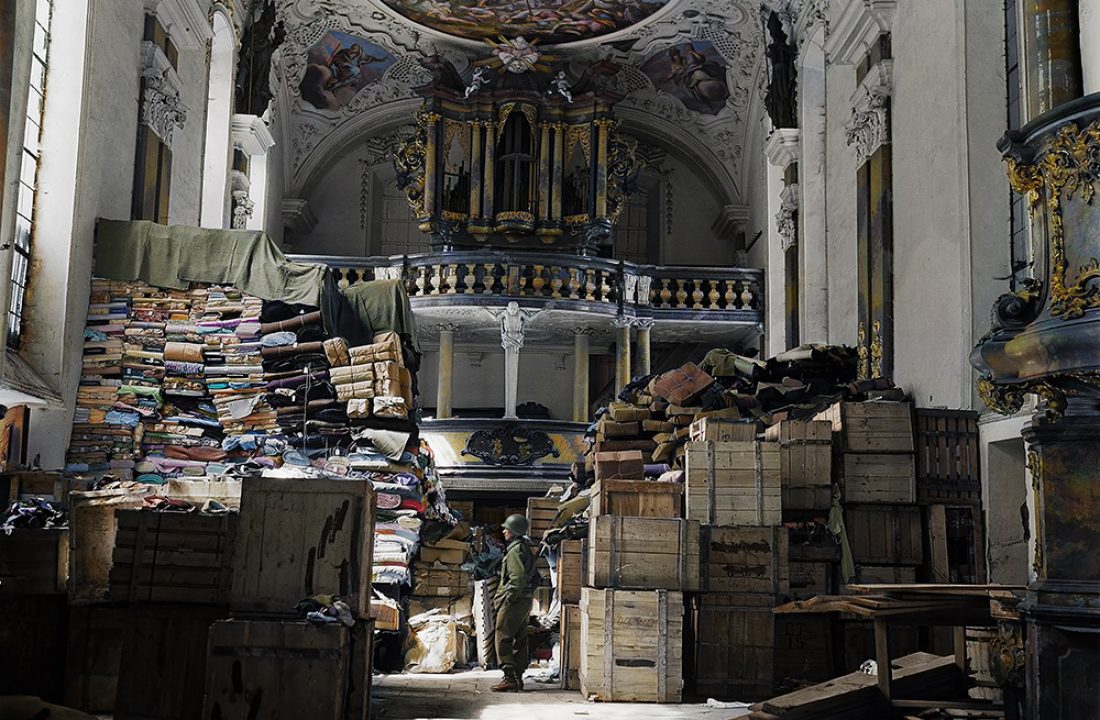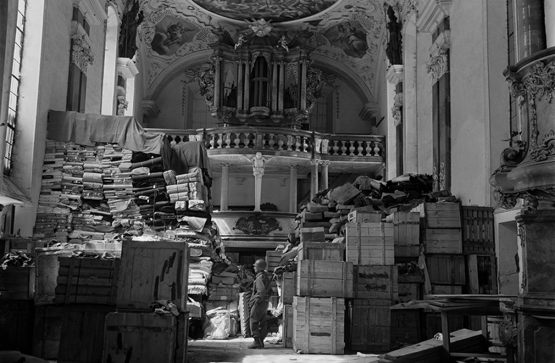 A US soldier from the Third Army views stacks of Jewish-owned art looted by the Nazi hidden in a church April 24, 1945 in Ellingen, Germany.
