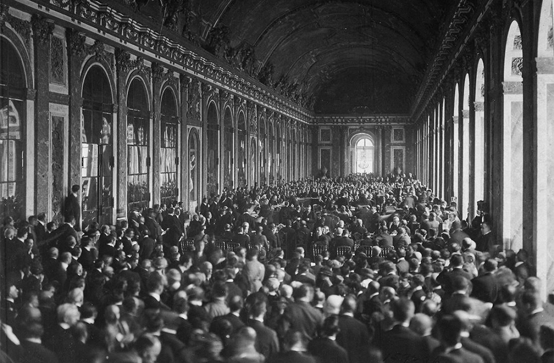 The delegations signing the Treaty of Versailles in the Hall of Mirrors. Versailles, France. June 28, 1919.